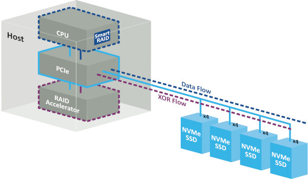 Gracias a la ejecución del software Smart Storage en la CPU principal, la transmisión de datos por las E/S alcanza su máximo rendimiento ya que se produce directamente desde la CPU principal hasta los puntos finales de NVMe a la velocidad de su generación correspondiente de PCIe; además se descarga la redundancia basada en paridad (XOR) desde la CPU principal hasta el hardware del acelerador. Esta arquitectura acaba con los cuellos de botella que suelen caracterizar a las soluciones tradicionales de almacenamiento en línea y ayuda al acelerador SmartRAID 4300 a alcanzar altos niveles de escalabilidad, flexibilidad y soporte para CPU principales de 4ª y 5ª generación con hasta 32 dispositivos NVMe x4 conectados a CPU y