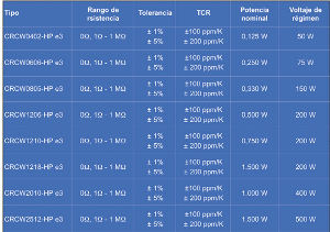 En la tabla adjunta se indican algunas de las características más importantes de la serie CRCW e3.