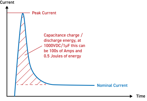 Observemos la Figura 3. Si existe una capacidad en el circuito, puede cambiar cuando esté presente haya una tensión alta. Si la capacidad está en el interruptor sin una carga que la limite, se descargará instantáneamente por el interruptor cuando se cierre. Muchas aplicaciones de alta tensión utilizan condensadores para almacenar las tensiones. Incluso los condensadores cargados con tensiones bastante bajas pueden provocar corrientes transitorias del orden de decenas de amperios cuando se cierra el interruptor, lo cual puede dañar los contactos del relé de manera significativa. Por tanto es necesario tener en cuenta la naturaleza de la capacidad en el circuito bien incluir protección frente a descargas. Está cuestión es analizar con gran detalle en la Guía Técnica Breve para Relés Reed de Pickering.