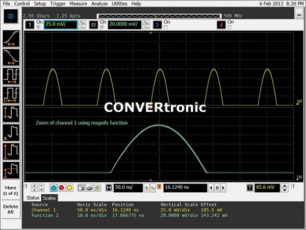 Por ejemplo, para agrandar una imagen con una función, asigne una función que amplíe el canal 1 del osciloscopio. El usuario puede cambiar la posición y la escala de la función de ampliación tal como se muestra en la Figura 4. De este modo, la ventana principal muestra toda la forma de onda, mientras que la función de ampliación agranda la zona objeto de estudio. La función matemática (zoom) no ofrecerá una resolución mejor que la generada por el osciloscopio con la forma de onda del canal, pero agrandarla le permitirá ver detalles que le habría resultado imposible observar en la forma de onda completa.