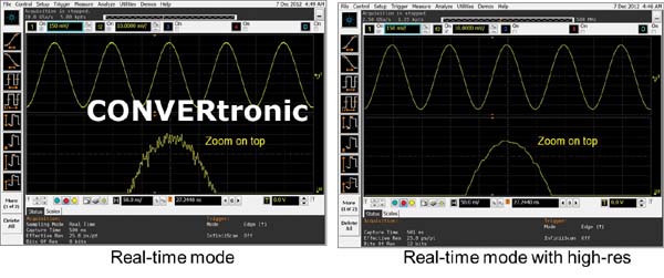 Todos los proveedores de primera fila ofrecen osciloscopios con modo de alta resolución. Se trata de un modo que incrementa los bits de resolución al tiempo que reduce el ruido. En este modo, el ADC realiza un sobremuestreo y, después, aplica un filtro. Suele utilizarse un filtro boxcar para promediar las hipermuestras intermedias. En muchos osciloscopios, el modo de alta resolución permite al usuario especificar los bits de resolución, lo que determinará la longitud de cada filtro boxcar. Por ejemplo, si en un osciloscopio con un ADC de 8 bits se activa el modo de alta resolución con un valor de 11 bits de resolución, cada boxcar estará compuesto por 8 (23) puntos de muestreo de ADC.