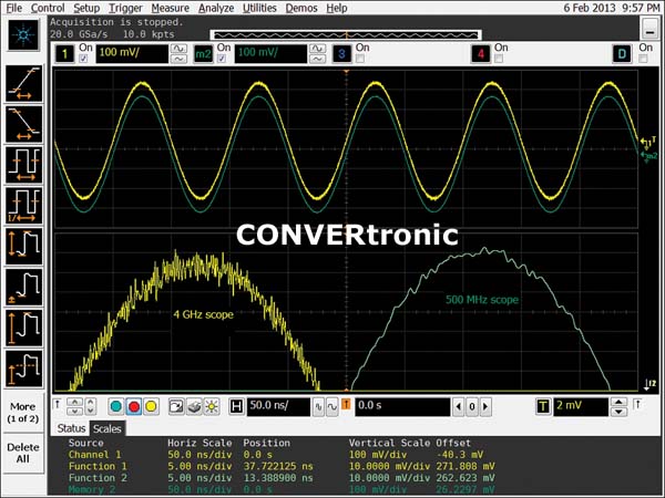 Reducir el ancho de banda de entrada del osciloscopio elimina el ruido de banda ancha que puede mermar la capacidad del osciloscopio de ver señales pequeñas. Lo ideal sería establecer el ancho de banda en tan solo 1 Hz por encima de lo que necesita el osciloscopio. Si el resto de las especificaciones son idénticas, al ver un detalle de señal de una onda sinusoidal de 10 MHz, un osciloscopio de 11 MHz obtendrá mejores resultados que uno de 50 GHz. ¿Por qué? Porque un mayor ancho de banda conlleva más ruido de banda ancha.