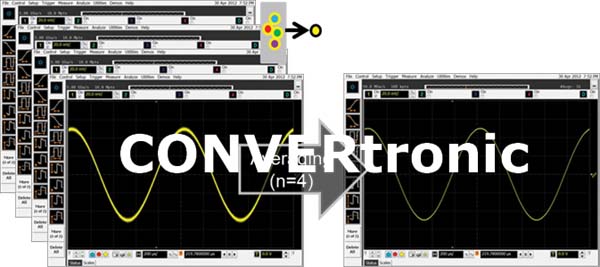 Los osciloscopios incorporan otro modo llamado promediado. Activar el promediado hace que el osciloscopio calcule la media de los valores verticales de cada forma de onda capturada con los valores verticales de formas de onda sucesivas. Los osciloscopios permiten al usuario especificar cuántas formas de onda desea promediar. El promediado es otra técnica que permite a los usuarios reducir el ruido del osciloscopio. A diferencia del modo de alta resolución que emplea técnicas de sobremuestreo, el promediado no funciona con adquisiciones de disparo único. El promediado precisa de una señal repetitiva y detectará cualquier anomalía poco frecuente que se produzca. Esta técnica reduce el ruido del osciloscopio y permite ver mejor las señales pequeñas.