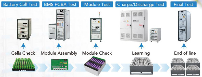 Una vez que un fabricante de automóviles completa la selección de células de la batería, el diseño de la batería y su desarrollo, entonces se enfrenta a cuellos de botella en el costo y la velocidad durante el proceso de producción en masa. La seguridad de la producción de la batería EV debe ser tomada en serio ya que el proceso abarca el peligro potencial de alta tensión y alta densidad de energía. El uso de un sistema automático de inspección de baterías puede reducir los costos de producción y mejorar el rendimiento de manera efectiva, y también asegura la seguridad de todo el proceso de fabricación. Además, las pruebas manuales pueden causar resultados inconsistentes, errores de datos manuscritos, largas horas de prueba, problemas de trazabilidad del producto y más. En la actualidad, los fabricantes de automóviles solicitan que la prueba EOL para los paquetes de baterías terminadas antes del envío 10 ~ 20 min / unidad con monitoreo en tiempo real, informes automáticos de la trazabilidad y mecanismos de protección de seguridad. Por lo tanto, la solución de prueba modular y automatizada ha sido adoptada gradualmente por muchos fabricantes de automóviles para la producción de baterías.