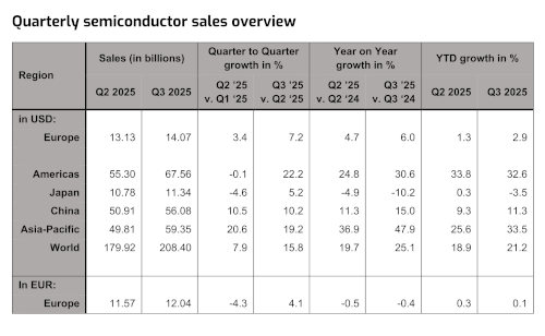A escala mundial, todas las regiones registraron un aumento de las ventas en el tercer trimestre de 2025, con un mercado mundial de semiconductores que alcanzó un total de 208 400 millones de dólares estadounidenses (un aumento del 15,8 % en el tercer trimestre frente al segundo trimestre de 2025). Este crecimiento se debió principalmente a América, con un aumento del 22,2 % en el tercer trimestre frente al segundo trimestre de 2025, seguida de Asia-Pacífico, con un 19,2 %, China, con un 10,2 %, y Europa, con un 7,2 %. Cabe señalar que se produjo un aumento muy significativo del 25,1 % en las ventas mundiales en el tercer trimestre de 2025 frente al tercer trimestre de 2024.