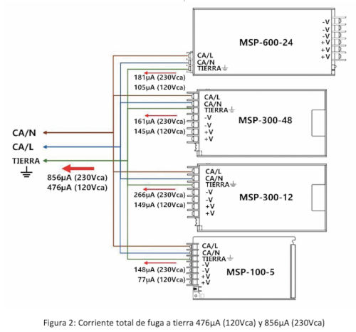 Figura 2: Corriente total de fuga a tierra 476μA (120Vca) y 856μA (230Vca)