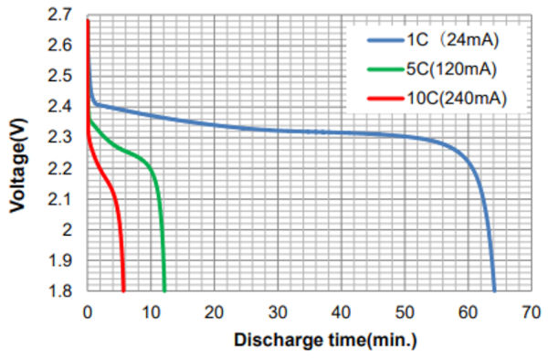 Figura 1. Características de la corriente de descarga: el gráfico muestra la tensión de salida en función del tiempo cuando se descarga una batería. Fuente: https://www.farnell.com/datasheets/2305652.pdf